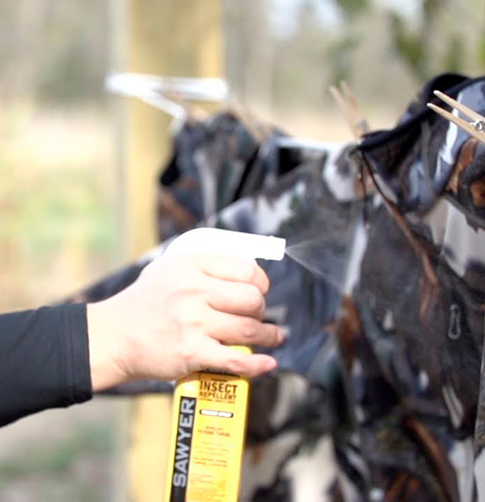 A diferencia de los repelentes tópicos de insectos aplicados sobre la piel, la permetrina se aplica a la ropa y al material para exteriores, y se adhiere a las fibras de la tela durante hasta 6 semanas (42 días) o 6 lavados.